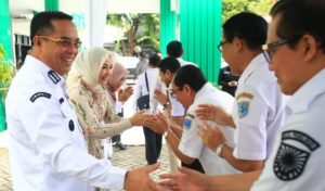 Wali Kota Probolinggo Dokter Aminuddin bersama sang Istri Dokter Evariani, Wakil Wali Kota Ina Dwi Lestari, Pj. Sekda Rey Suwigtyo menyambut karyawan-karyawati yang dibagi dalam dua sesi, pukul 08.00 dan pukul 10.00. Acara mengawali, Wali Kota Dokter Aminuddin menuturkan, Halalbihalal ini merupakan suatu budaya tradisi yang telah dilaksanakan.