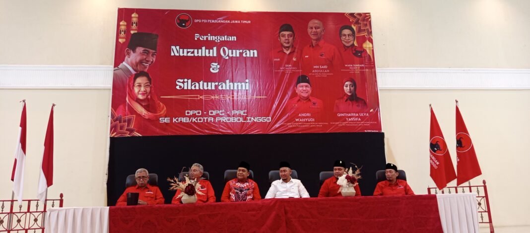 Dewan Pimpinan Daerah (DPD) PDI Perjuangan Jawa Timur menggelar acara safari ramadhan yang sekaligus memperingati Nuzulul Qur’an 1447H di Paseban Sena, Jalan Suroyo, Kota Probolinggo. Acara ini dihadiri oleh Ketua DPC PDI Perjuangan Kabupaten Probolinggo, H. Khairul Anam, Ketua DPC PDI Perjuangan Kota Probolinggo, Tomy Wahyu Prakoso, serta seluruh Pengurus Dewan Pimpinan Cabang (DPC) Partai Demokrasi Indonesia Perjuangan (PDIP) kabupaten dan kota, Pengurus Anak Cabang (PAC) se-kabupaten dan kota Probolinggo, dan semua anggota Fraksi, pada Rabu (11/3/2026).